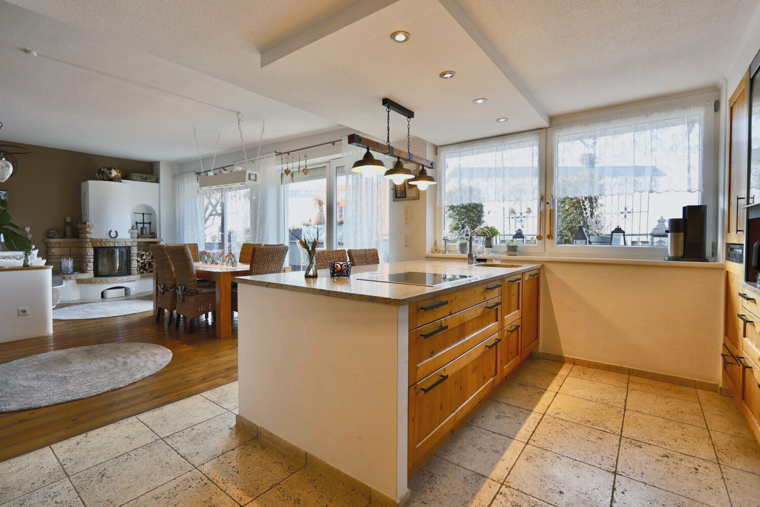 Diese stilvolle Dachgeschosswohnung mit rund 120 m² Wohnfläche vereint modernes Wohnen mit großzügigem Raumgefühl und einem beeindruckenden Ausblick. Große, bodentiefe Fenster im Wohnbereich sorgen für viel Tageslicht und schaffen eine helle, einladende Atmosphäre.