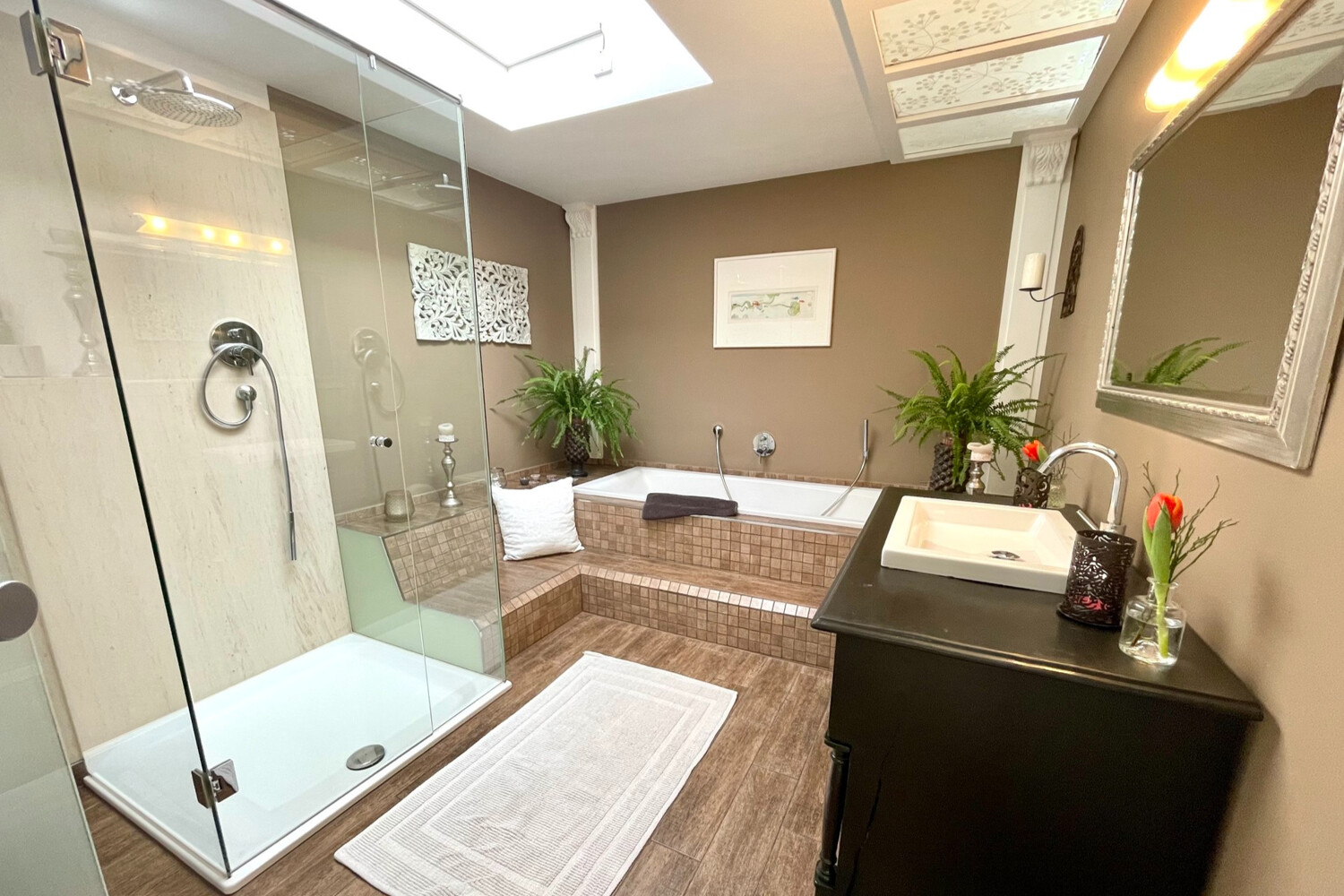 Hochwertige Bodenbeläge sowie die offen gestaltete Küche unterstreichen den eleganten Charakter der Wohnung. Das großzügige Badezimmer ist mit einer Badewanne und einer separaten Dusche ausgestattet und bietet hohen Komfort.